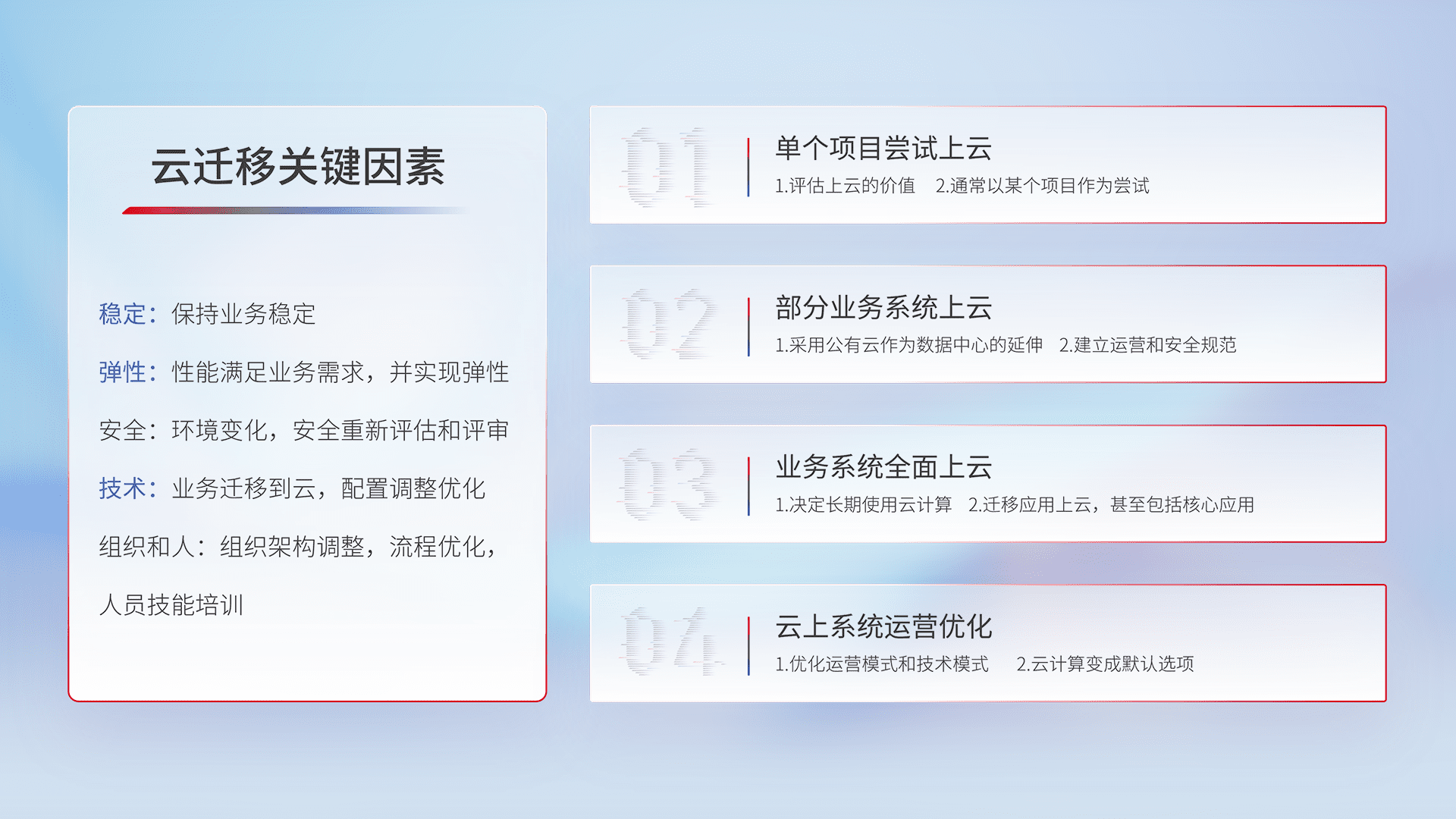 结合实际业务,,,从规划设计、、、云平台选型、、、云原生改造、、、、数据迁移、、集成交付,,迁移全过程为客户识别最佳上云路径,,,做好风险识别管理,,,设计网络架构、、、身份权限、、、、安全审计合规、、操作审计、、、、日志审计、、、监控告警策略、、多站点容灾设计等,,,,对云上基础设施进行整体规划,,,,提升IT治理水平,,以满足弹性、、、高可用、、、、高性能的需求。。