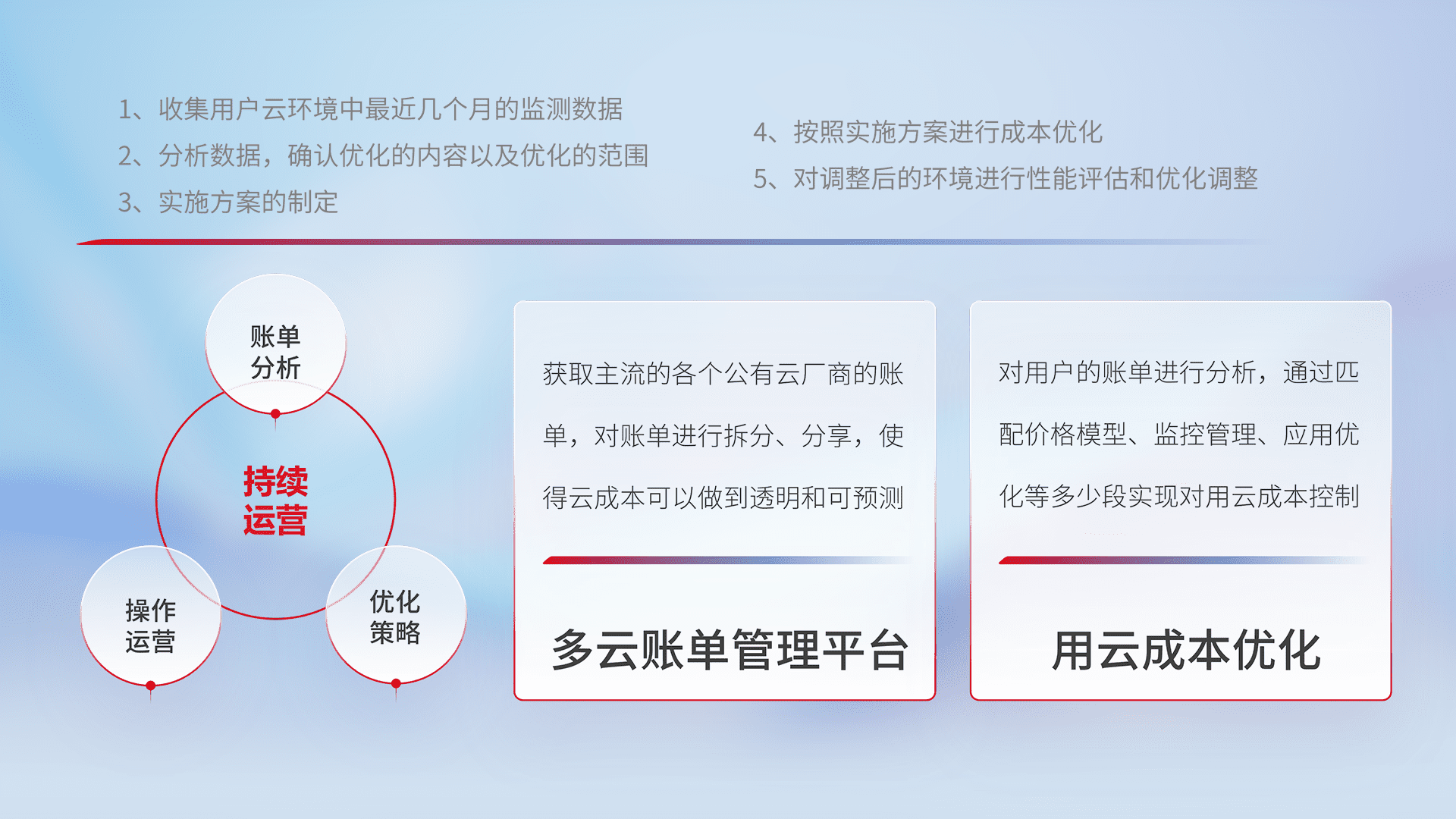 通过多云纳管,,,,以统一的资源数据模型把客户的云资源进行抽象和封装,,,进而实现对多云资源的统一操作,,,保障云资源管理的可靠性、、稳定性与可用性。。。量身定制化运维内容,,配置、、、开发运维、、、、补丁管理、、、、备份、、监控、、、、认证和访问管理、、、、审计和日常巡检等,,,保障在用云过程中的可靠度,,,,稳定度以及高可用率。。