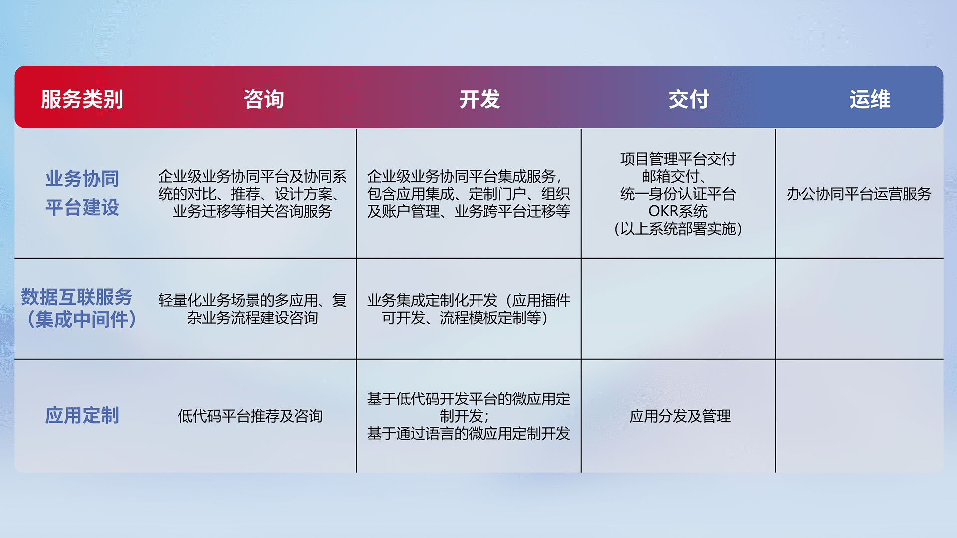 针对钉钉、、企微、、IDaas等平台级产品提供产品的规划、、、、方案、、交付、、、、定制化开发等服务,,,,实现如统一协同办公、、、智能客户服务、、、、混合会议管理、、、智能数据查询、、、等业务场景,,,实现数字化转型。。
